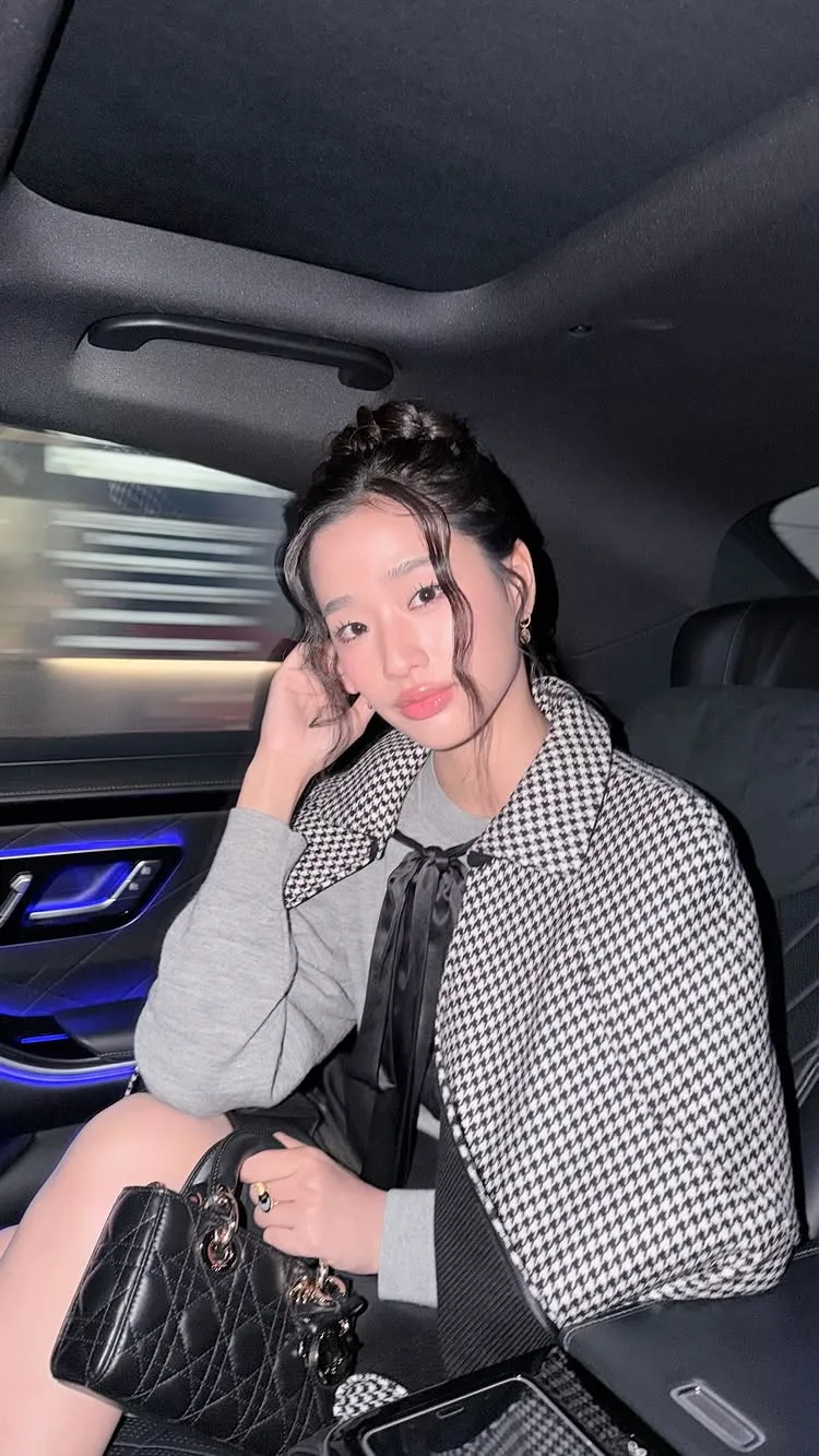 Ia melengkapi penampilannya dengan tas hitam kecil yang terlihat seperti koleksi Lady Dior. Tas berstruktur dengan detail logam ini memberi sentuhan glamor tanpa terlihat berlebihan.