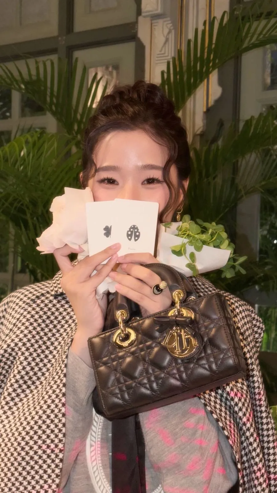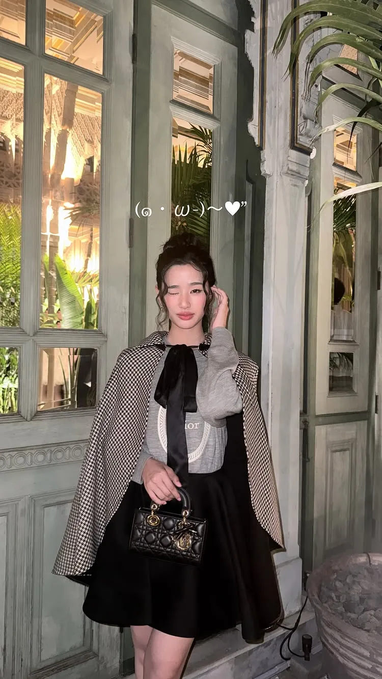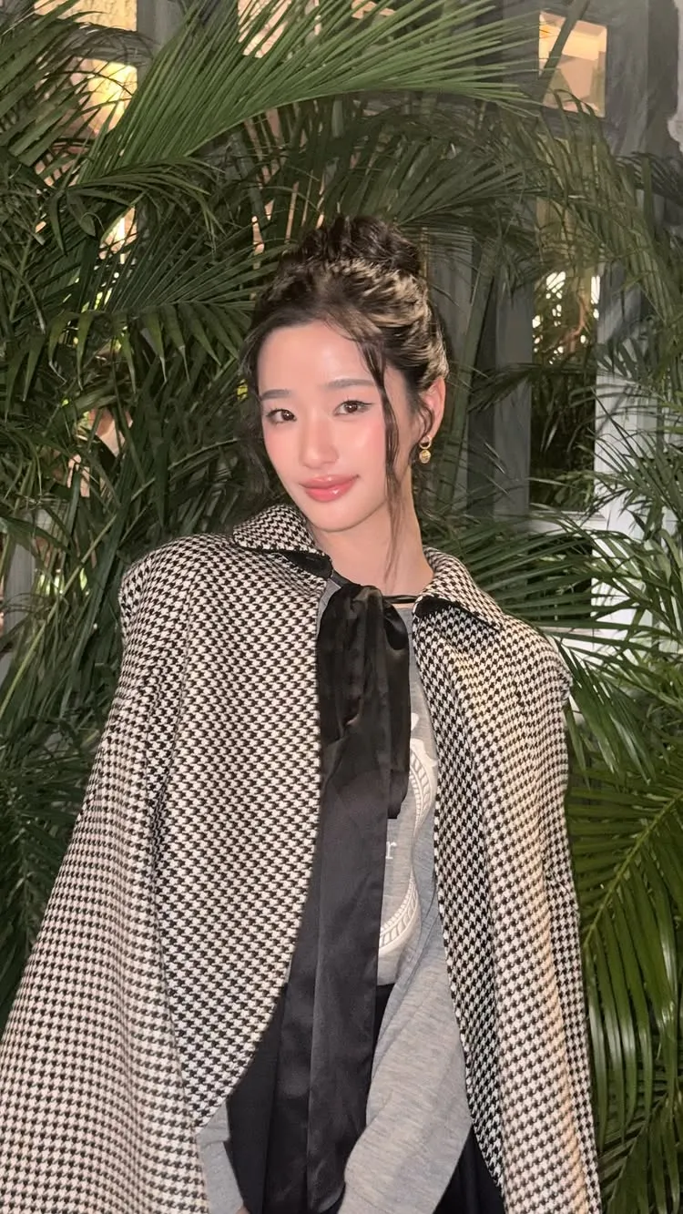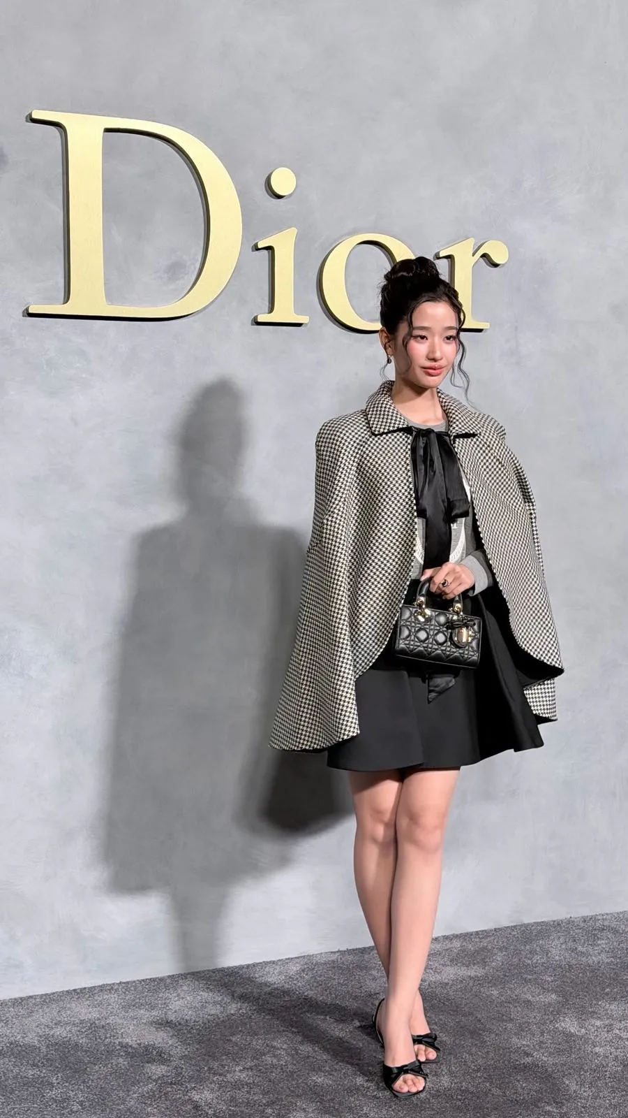 Salah satu highlight dari penampilannya adalah cape bermotif houndstooth hitam putih. Potongan cape tersebut memberi nuansa vintage sekaligus memperkuat aura elegan khas Dior.