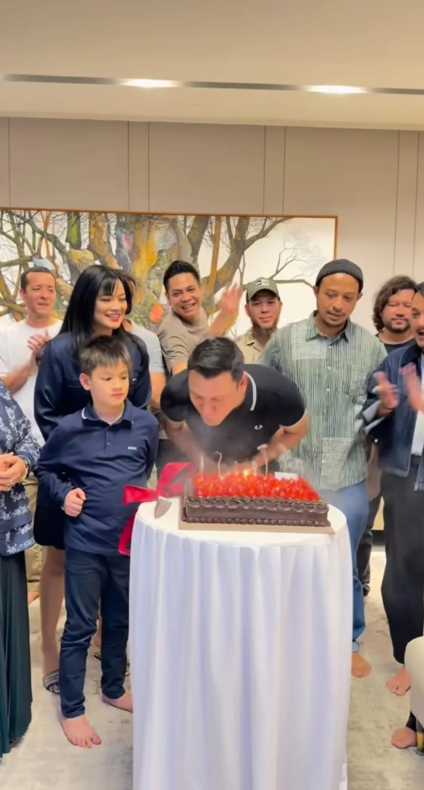 Christian Sugiono tampak antusias saat bersiap meniup lilin di atas kue ulang tahunnya. Suasana perayaan terasa sangat meriah dengan sorak-sorai dari keluarga dan para sahabat.