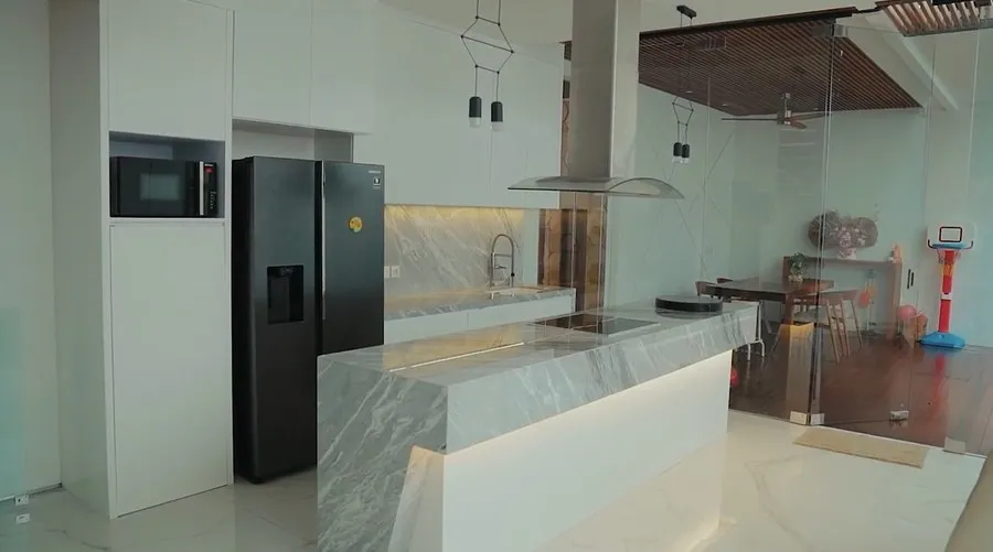 Dapur rumah Raditya Dika dan Anissa Aziza terlihat elegan dengan full marmer. Komika sukses ini memiliki konsep dapur open space dengan ruang keluarga.
