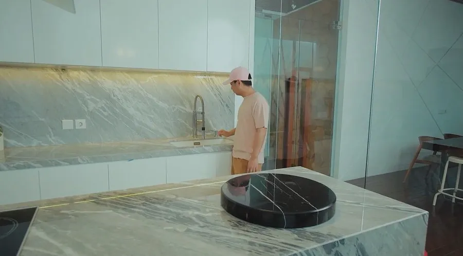 Di kitchen island dapur rumah Radit terdapat tatakan serbaguna. Berbentuk bulat dan terbuat dari marmer.