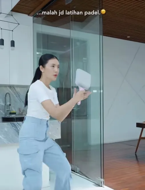 Area dapur Raditya Dika tampak luas serta terhubung dengan ruangan lain yang dibatasi dengan kaca transparan.