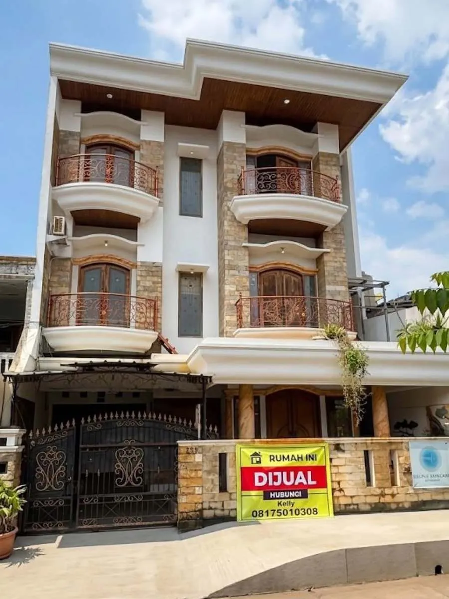 Rumah yang dijual Della Puspita tampak megah dan mewah dengan tiga lantai. Desain eksterior rumah tersebut tampak klasik dengan sentuhan batuan alam yang semakin memberi kesan megah dan juga terlihat sangat kokoh.