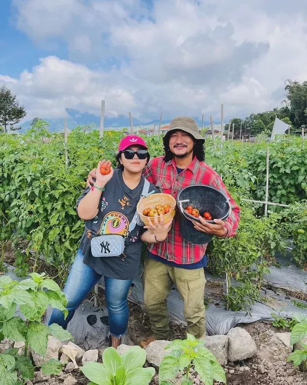 Selain menanam sendiri di kebun, Isa juga terlihat panen tomat sendiri bersama istri tercintanya.