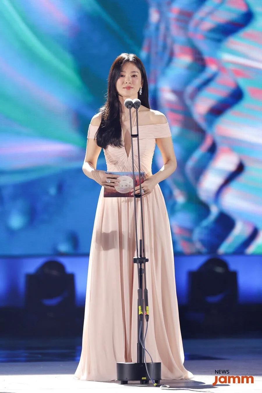 Di Baeksang Arts Awards 2024, Song Hye Kyo kembali tampil memikat dengan gaun off-the-shoulder. Saat itu, ia dipercaya sebagai presenter kategori Best Actress.
